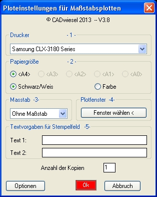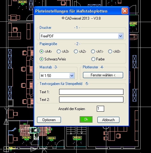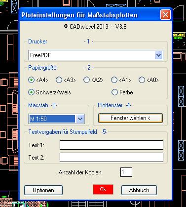 OK Button startet den Druckvorgang. Es wird ein Layout angelegt, die Vorlagenzeichnung 'plot.dwg' eingefügt, alle Ausschnitte positioniert, der Planstempel ausgefüllt und an den Drucker geschickt.