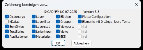 unreferenzierten Blöcke, leeren Layer, Bemassungsstile, Applikationseinträge, Textstile, Linientypen, Koordinatensysteme, Ansichten, Ansichtsfenster, Layouts, Gruppen, Wörterbucheinträge, Xdata, Layerfilter, Layerstände, (P)Linien mit einer Länge von 0, Leere (M)Texte, Materialien, Plotterkonfigurationen