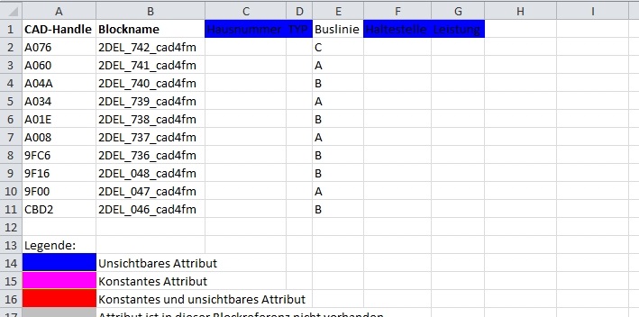 Spalte A enthält die CAD-Handles der Blockreferenzen und darf nicht verändert werden.