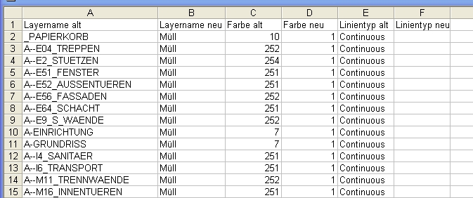 Zum Einen enthält das Programmpaket eine Funktion um alle Layer einer Zeichnung in eine Excel Datei zu schreiben. Dies hat den Vorteil, das der Anwender nur noch die Spalten ausfüllen muss, die er auch geändert haben möchte. Änderbare Spalten sind: 'Layername neu', 'Farbe neu' und 'Linientyp neu'. Layer die nicht geändert werden sollen, können einfach so in der Liste bleiben, wie sie ausgelesen wurden (es wird kein neuer Name angegeben).